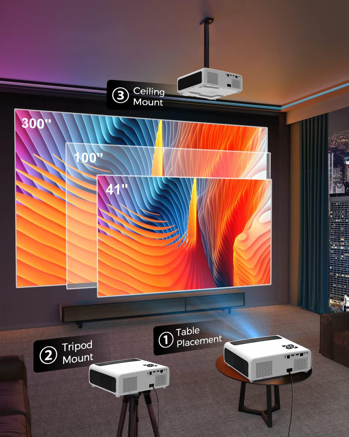 - Attēla izmērs: 50-300" collas,