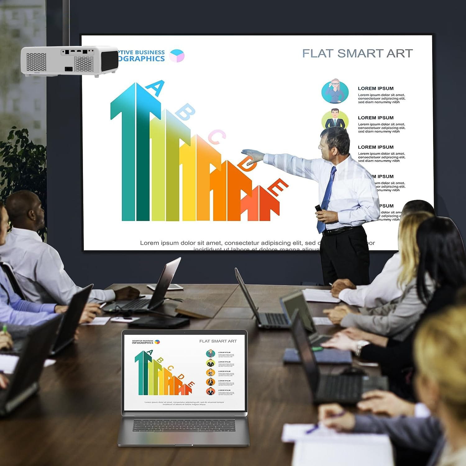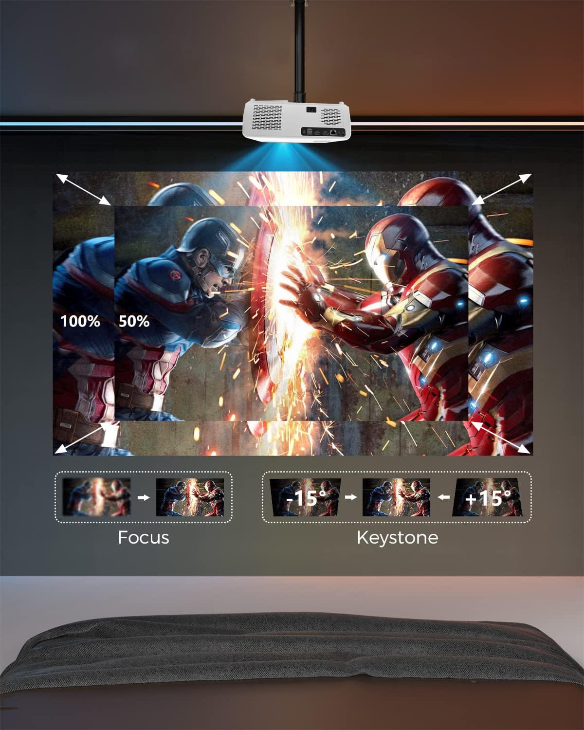 ✅ Ērta lietošana un neierobežotas regulēšanas iespējas - autofokuss - automātiskā fokusēšana dažu sekunžu laikā, automātiskā korekcija vertikāli un horizontāli (Autokeystone 4D), ZOOM funkcijas iespēja samazināt attēlu, lai tas atbilstu sienai, projektors var projicēt taisnu attēlu pat stāvot sāniski pret sienu(sānu projekcija ),360 funkcija - 360 grādu rotācijas iespēja, aizmugures projekcija.