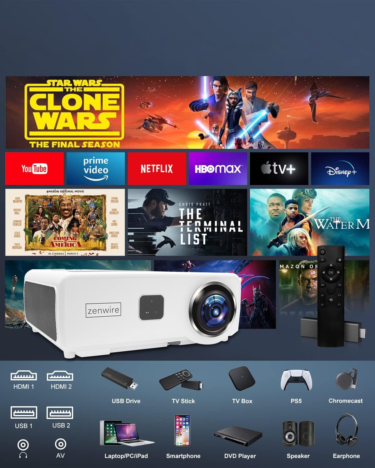 ✅ Zenwire e660h projektors ar ANDROID SMART TV ar piekļuvi populārām lietotnēm, piemēram, Netflix, Youtube, Prime Video, HBO GO, Spotify, Disney+ un citām! Atskaņojiet savas iecienītākās filmas tieši projektorā bez papildu ierīcēm!